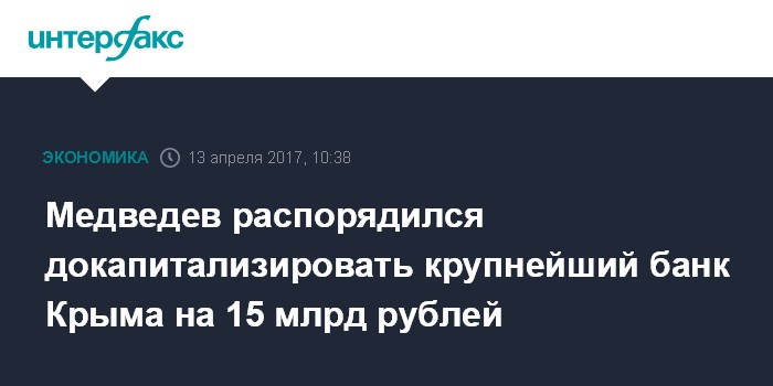 Медведев распорядился докапитализировать крупнейший банк Крыма на 15 млрд рублей