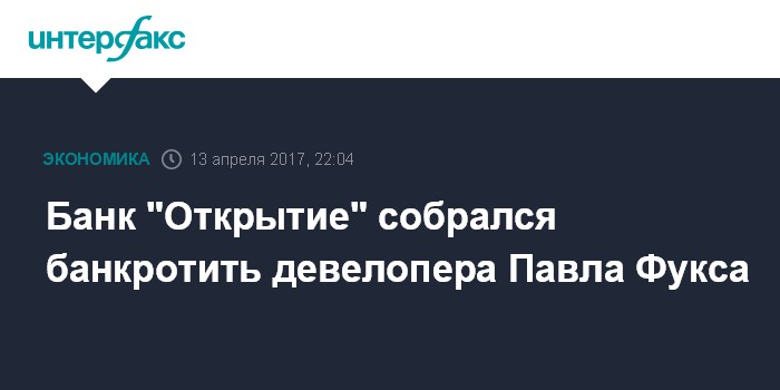 Москва. 13 апреля. INTERFAX.RU - Банк "ФК "Открытие" намерен обратиться в арбитражный суд с заявлением о банкротстве Павла Фукса, говорится в уведомлении кредитной организации на Федресурсе.
