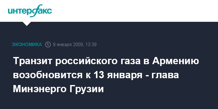 Тбилиси. 9 января. INTERFAX.RU - Транзит российского газа в Армению, который в пятницу утром был приостановлен из-за аварии на магистральном газопроводе, возобновится к 13 января, заявил министр энергетики Грузии Александр Хетагури.