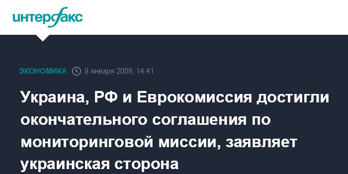 Брюссель. 9 января. INTERFAX.RU - Представители Украины, Европейской комиссии и России достигли окончательного соглашения в отношении мониторинговой миссии, в состав которой также будут входить представители российской стороны, заявляет уполномоченный представитель президента Украины по международным вопросам энергетической безопасности Богдан Соколовский.