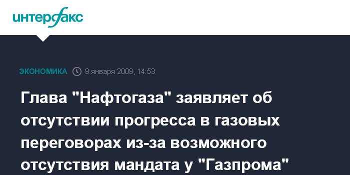 Киев. 9 января. INTERFAX.RU - Прогресс в переговорах Национальной акционерной компании "Нафтогаз Украины" с ОАО "Газпром" пока не достигнут из-за возможного отсутствия у представителей "Газпрома" соответствующих полномочий и мандата на подписание каких-нибудь контрактов с делегацией НАК, заявляет глава украинской компании Олег Дубина.