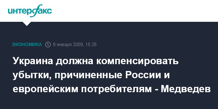 Сочи. 9 января. INTERFAX.RU - Президент РФ Дмитрий Медведев убежден, что европейские потребители, как и российская сторона, должны потребовать, чтобы украинская сторона компенсировала убытки в связи с ситуацией, связанной с транзитом российского газа через Украину.