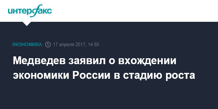"В целом ситуация в экономике действительно за последний год изменилась. Наша экономика вошла в стадию роста, мы наблюдали это и в конце прошлого года и в начале этого года наблюдаем. В частности, по итогам прошлого года - это очень важно - рост промышленного производства составил 1,3%", - сказал Медведев.