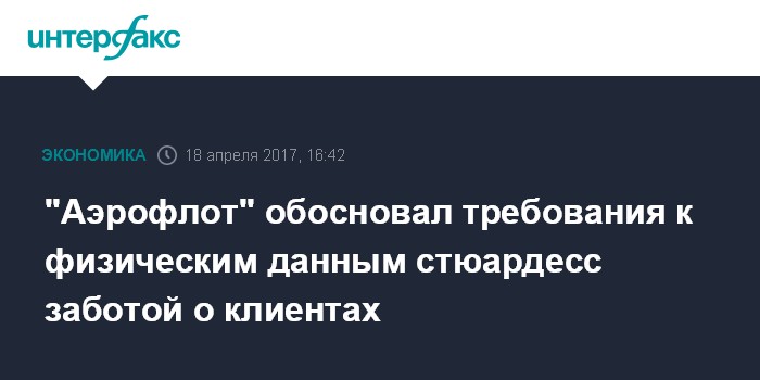Москва. 18 апреля. INTERFAX.RU - "Аэрофлот" в суде обосновал внутренние требования к физическим данным бортпроводников желанием угодить пассажирам, а также экономическим фактором - чем больший вес приходится поднимать самолету, тем больше денег расходуется на топливо.