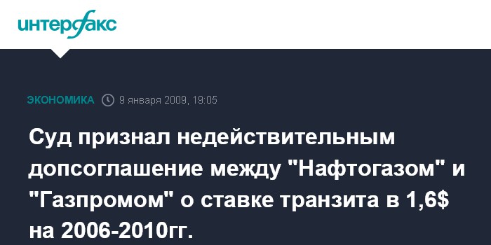 Киев. 9 января. INTERFAX.RU - Хозяйственный суд Киева признал недействительным заключенное между Национальной акционерной компанией (НАК) "Нафтогаз Украины" и российским ОАО "Газпром" дополнительное соглашение, согласно которому ставка транзита газа по территории Украины составляла $1,6 за 1 тыс. куб. м на 100 км расстояния на 2006-2010 гг.