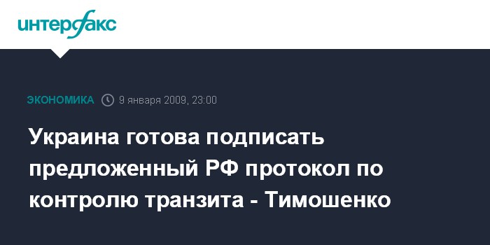 Киев. 9 января. ИНТЕРФАКС-УКРАИНА - Премьер-министр Украины Юлия Тимошенко заявляет, что Украина готова подписать предложенный Россией вариант многостороннего протокола по созданию международной комиссии по мониторингу транзита газа через украинскую территорию.