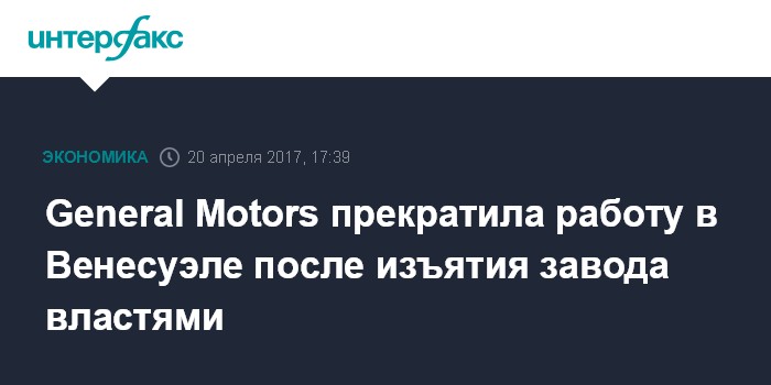 Москва. 20 апреля. INTERFAX.RU - Крупнейший автопроизводитель США General Motors остановил деятельность в Венесуэле в четверг после того, как власти страны заявили об изъятии завода компании и всей продукции. Компания описала эти действия как "незаконный захват ее активов".
