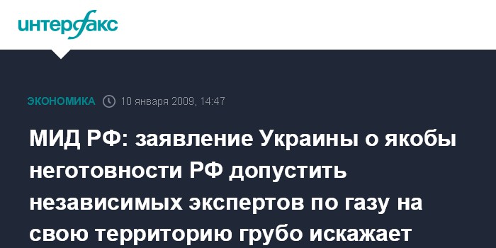 Москва. 10 января. INTERFAX.RU - Москва расценивает как "грубое искажение действительности" заявление украинской стороны о якобы неготовности РФ принять на своей территории международных экспертов по газу, считают в МИД России.