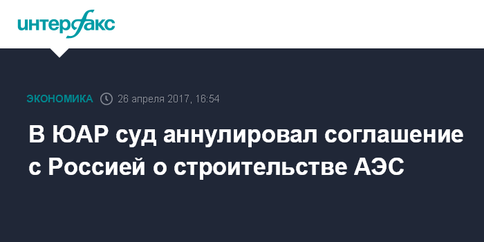 Москва. 26 апреля. INTERFAX.RU - Верховный суд провинции Западный Кейп признал незаконными соглашения ЮАР с различными странами, в том числе и с Россией о строительстве АЭС общей мощностью до 9,6 ГВт. По сообщению местного издания IOL, решение суда аннулирует соглашения о сотрудничестве с США, Россией и Южной Кореей. Суд решил, что любые сделки по строительству атомных станций должны проходить одобрение парламента.