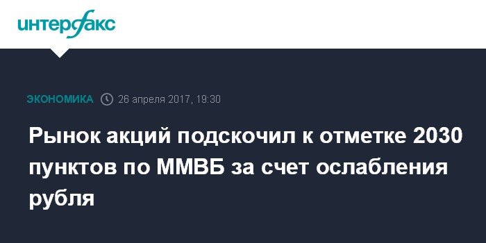 Москва. 26 апреля. INTERFAX.RU - Рынок акций РФ в среду поднялся к 2030 пунктам по индексу ММВБ на фоне ослабления рубля, что оказало давление на индекс РТС; упали на 40% и достигли нового ценового "дна" акции признанной банкротом "Группы "Разгуляй", и подешевели на 7% бумаги ПАО "Объединенная вагонная компания" на фоне стартовавшего вторичного размещения допэмиссии акций.