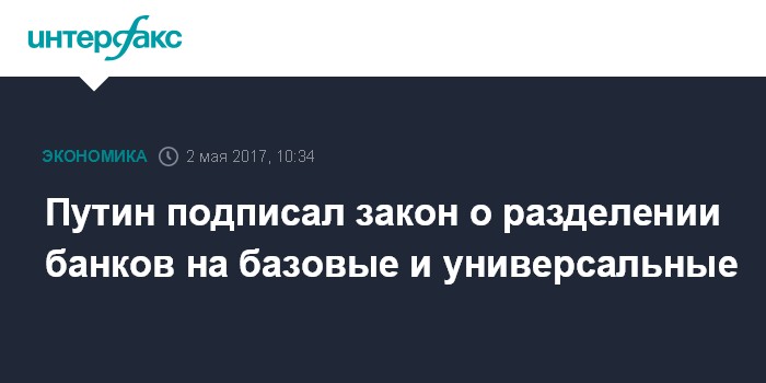 Москва. 2 мая. INTERFAX.RU - Президент России Владимир Путин подписал закон о разделении банков по перечню разрешенных операций в зависимости от их лицензии.