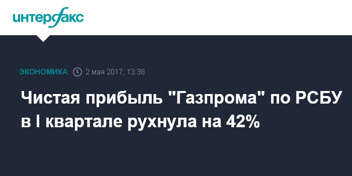 Москва. 2 мая. INTERFAX.RU - Чистая прибыль головной компании ПАО "Газпром" по российским стандартам бухучета за первый квартал 2017 года снизилась на 42% - до 107,64 млрд рублей со 187,207 млрд рублей за январь-март 2016 года, свидетельствуют расчеты "Интерфакса" на основе материалов "Газпрома".
