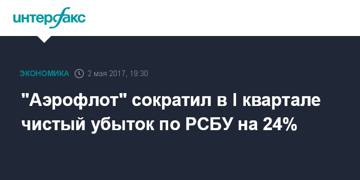 Москва. 2 мая. INTERFAX.RU - "Аэрофлот" сократил в I квартале 2017 г. чистый убыток по РСБУ на 24% в годовом выражении, до 2,29 млрд руб., следует из отчетности авиакомпании.