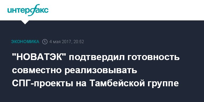 "НОВАТЭК", реализуя проект "Ямал СПГ", получил уникальный опыт и компетенции в развитии СПГ-проектов в Арктике. Мы подписали соглашение с крупнейшими инжиниринговыми компаниями и определили технологическую платформу для реализации будущих проектов СПГ, тем самым подтвердив свою стратегическую направленность на развитие производства СПГ в российской Арктике и увеличение доли нашей страны в мировом балансе СПГ. Мы уже заявляли и подтверждаем сейчас свою заинтересованность в совместной реализации СПГ-проектов на ресурсной базе Тамбейской группы месторождений", - передал "Интерфаксу" глава "НОВАТЭКа" Леонид Михельсон через своего представителя.