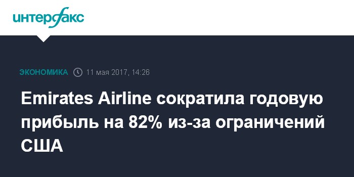 Москва. 11 мая. INTERFAX.RU - Авиакомпания Emirates Airline, входящая в Emirates Group (ОАЭ), сократила чистую прибыль по итогам 2016-2017 финансового года, завершившегося 31 марта, на 82% из-за сложившихся на рынке неблагоприятных условий, включая ограничения в отношении авиаперелетов, объявленные администрацией президента США Дональда Трампа, и теракты в Европе.