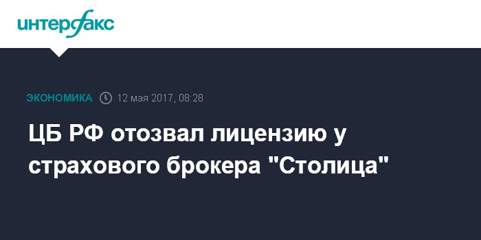 Москва. 12 мая. INTERFAX.RU - ЦБ РФ отозвал лицензию на осуществление страховой брокерской деятельности у ООО "Страховой брокер "Столица" (Москва), говорится в сообщении регулятора.