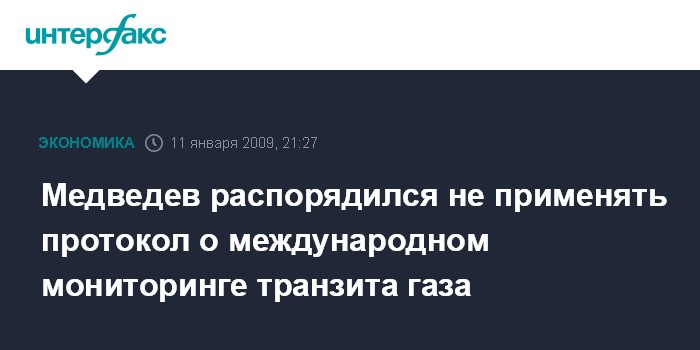 Москва. 11 января. INTERFAX.RU - Президент РФ Дмитрий Медведев дал указание правительству РФ не применять подписанный Украиной протокол о многостороннем, международном механизме мониторинга за транзитом российского газа в Европу через Украину до того, как украинская сторона не снимет свои оговорки к этому документу.