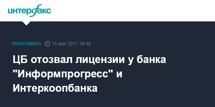 Москва. 15 мая. INTERFAX.RU - ЦБ РФ отозвал лицензии на осуществление банковских операций у банка содействия развитию торговли и снабжения "Информпрогресс" (Москва) и Интеркоопбанка (Москва), говорится в сообщении регулятора.