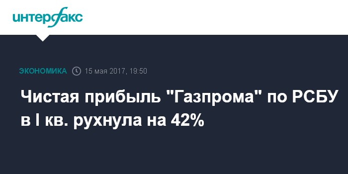 Москва. 15 мая. INTERFAX.RU - Чистая прибыль головной компании ПАО "Газпром" по РСБУ за первый квартал 2017 года снизилась на 42% - до 107,64 млрд рублей со 187,207 млрд рублей за январь-март 2016 года, говорится в ежеквартальном отчете компании.