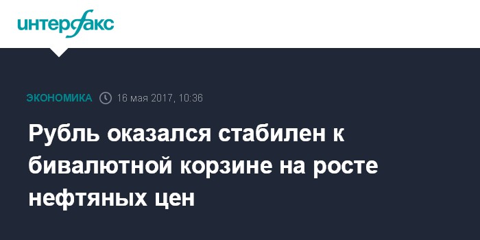 Как отмечают эксперты "Интерфакс-ЦЭА", рубль стабилен к бивалютной корзине при открытии торгов во вторник благодаря продолжающим повышаться ценам на нефть. Цены на нефть растут во вторник после значительного подъема по итогам предыдущей сессии на ожиданиях продления срока действия соглашения об ограничении добычи нефти. Стоимость июльских фьючерсов на нефть Brent на лондонской бирже ICE Futures к 10:01 по московскому времени выросла на 0,33% - до $51,99 за баррель. Цена фьючерса на нефть WTI на июль на электронных торгах Нью-йоркской товарной биржи (NYMEX) поднялась к этому времени на 0,35% - до $48,98 за баррель.