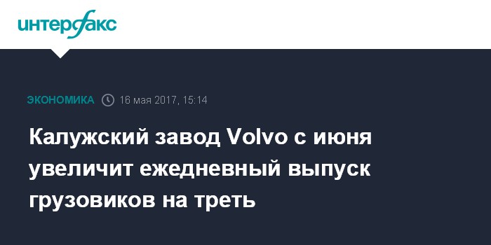 Москва. 16 мая. INTERFAX.RU - "Вольво Восток" (управляет российскими заводами Volvo) с июня нарастит производство грузовиков на калужском заводе до 24 штук в день, сообщил директор калужского завода Volvo Group Trucks Абденассер Абуаюб в ходе посещения завода губернатором региона Анатолием Артамоновым. В настоящее время на предприятии производится 18 грузовиков в день. Таким образом, производство вырастет на треть.