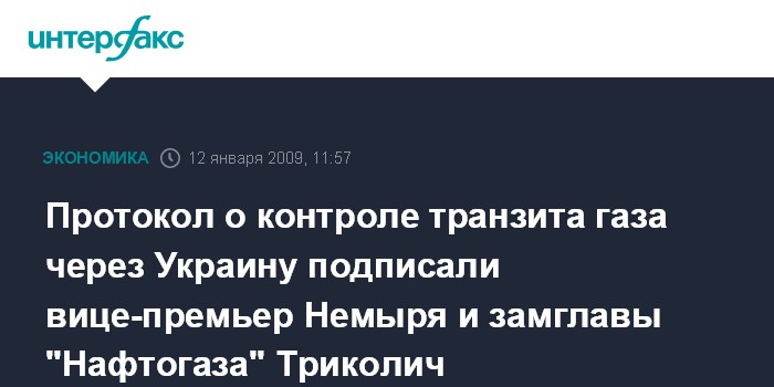 Москва. 12 января. INTERFAX.RU - "Протокол о международном контроле за транзитом российского газа через территорию Украины подписан вице-премьером кабинета министров Украины Григорием Немырей и заместителем председателя правления НАК "Нафтогаз Украины" Владимиром Триколичем, сообщил "Интерфаксу" источник в Киеве.