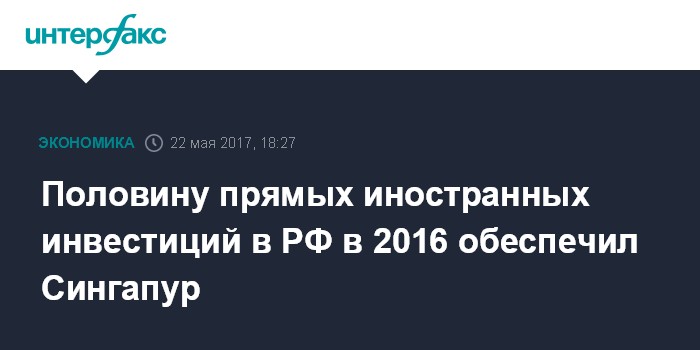 Москва. 22 мая. INTERFAX.RU - Резиденты Сингапура в 2016 году обеспечили прямые инвестиции в размере $16,3 млрд, что составляет половину от общей суммы прямых иностранных инвестиций в экономику РФ за год ($33,0 млрд), свидетельствует данные, опубликованные на сайте ЦБ РФ. Причем 93% годовой суммы сингапурских инвестиций ($15,1 млрд) пришлось на 4-й квартал прошлого года.