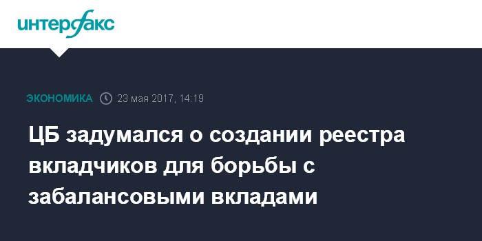 Москва. 23 мая. INTERFAX.RU - ЦБ РФ всерьез задумался над созданием реестра вкладчиков для борьбы с забалансовыми вкладами, заявил первый зампред Банка России Дмитрий Тулин, выступая в Госдуме.