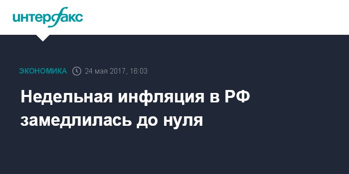 Москва. 24 мая. INTERFAX.RU - Инфляция в России с 16 по 22 мая замедлилась до нуля после трех недель роста по 0,1%, сообщил в среду Росстат. Последний раз нулевой рост цен на неделе фиксировался в конце марта. С начала месяца инфляция к 22 мая составила 0,2%, с начала года - 1,5%. Среднесуточный прирост цен за 22 дня мая составил 0,01% против 0,013% за 23 дня мая 2016 года.