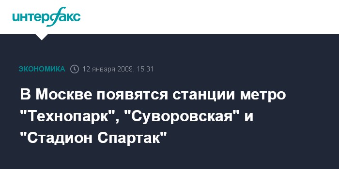 "В ближайшие шесть лет московский метрополитен прирастет еще тремя новыми станциями на действующих линиях. Станция "Технопарк" будет построена на Замоскворецкой линии между "Автозаводской" и "Коломенской". Станцию "Стадион Спартак" построят на Таганско-Краснопресненской линии, между "Щукинской" и "Тушинской". А "Суворовскую" - на Кольцевой ветке, между "Проспектом Мира" и "Новослободской", - сообщил собеседник агентства.