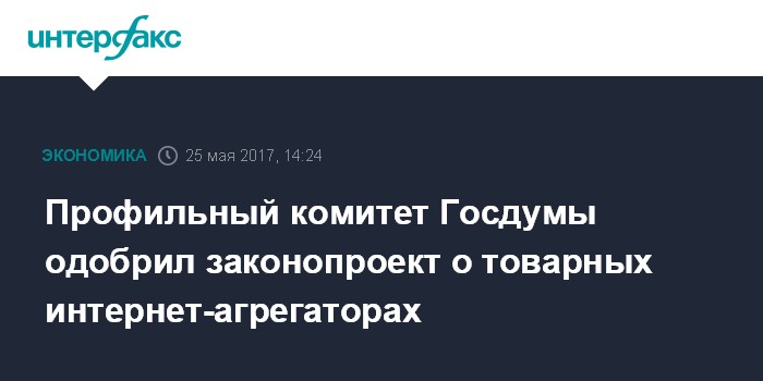 Москва. 25 мая. INTERFAX.RU - Комитет Госдумы по экономической политике и предпринимательству на заседании в четверг рекомендовал нижней палате парламента принять в первом чтении законопроект, вводящий понятие товарного агрегатора и ответственность за предоставление им заведомо недостоверной информации о товаре (услуге) и продавце.