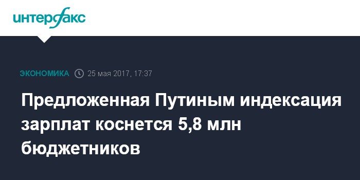 Москва. 25 мая. INTERFAX.RU - Индексация зарплат, которую предложил накануне президент РФ Владимир Путин, может коснуться порядка 5,8 млн работников бюджетной сферы, сообщили в Минтруде РФ.