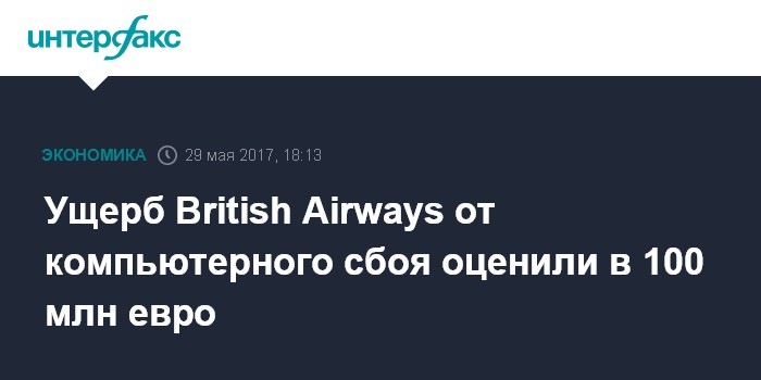 Москва. 29 мая. INTERFAX.RU - Компьютерный сбой в системе British Airways, ставший причиной отмены сотен авиарейсов в лондонских аэропортах, может стоить авиакомпании 100 млн евро, прогнозируют эксперты Citigroup. "Мы полагаем, что общие потери составят 100 млн евро, включая 40 млн евро потерянной выручки и 60 млн евро компенсаций клиентам в соответствие с законодательством Евросоюза", - считают аналитики. По оценкам банка, "порядка 175 тыс. пассажиров пострадали из-за отмены рейсов только 27 мая", пострадавшие были и 28 и 29 мая.