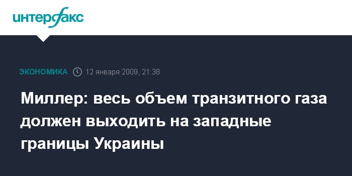 Москва. 12 января. INTERFAX.RU - Весь объем газа, который "Газпром" будет направлять через Украину, на 100% должен выходить на западные границы Украины для наших европейских потребителей, сообщил глава "Газпрома" Алексей Миллер.