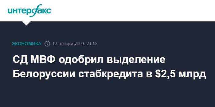 Москва. 12 января. INTERFAX.RU - Совет директоров МВФ в понедельник принял решение о предоставлении Белоруссии стабилизационного кредита на $2,5 млрд, сообщили агентству "Интерфакс" в белорусском офисе фонда.