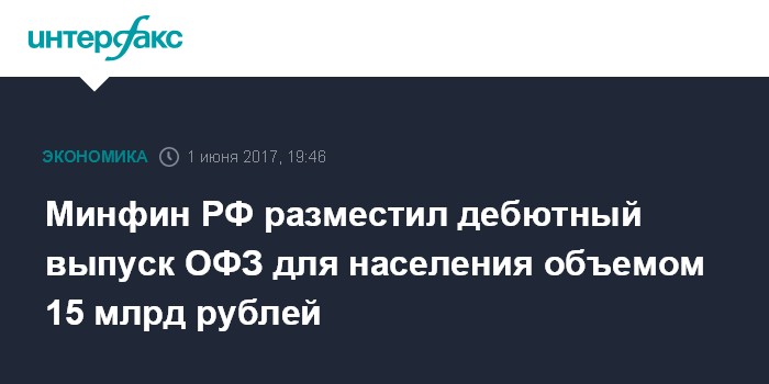 Минфин РФ разместил дебютный выпуск ОФЗ для населения объемом 15 млрд рублей