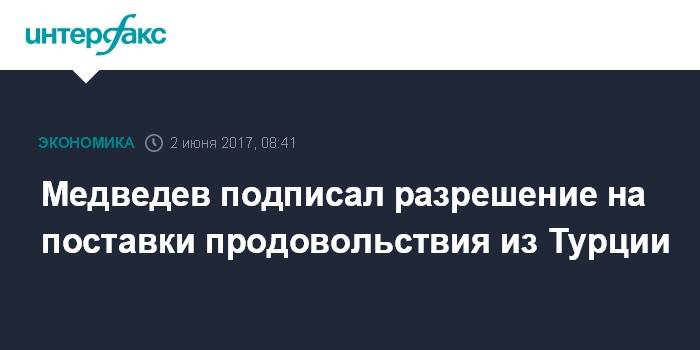 Москва. 2 июня. INTERFAX.RU - Глава правительства РФ Дмитрий Медведев подписал постановление о снятии ограничений на поставки продовольствия в Россию из Турции.