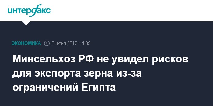 Москва. 8 июня. INTERFAX.RU - Минсельхоз не видит рисков для экспорта российского зерна из-за введения Египтом требования нулевого содержания спорыньи в импортируемой пшенице.