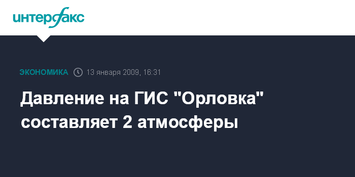 Москва. 13 января. INTERFAX.RU - Давление на входе на украинскую газоизмерительную станцию (ГИС) "Орловка" (Одесская обл.) на границе с Румынией составляет 2 кг на 1 кв см или две технических атмосферы, сообщил агентству "Интерфакс" начальник Одесского управления магистральных газопроводов Борис Девдера.