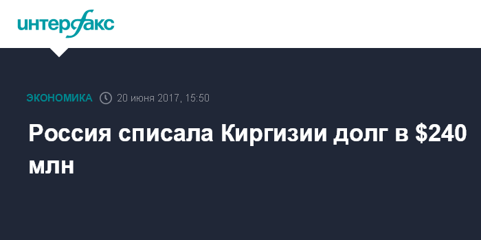 Россия в первом полугодии 2016 года списала долги Киргизии на сумму $30 млн, общий долг республики перед РФ на конец июня 2016 года составлял $270 млн. В целом за последние 11 лет Россия списала Киргизии $703,2 млн внешнего долга.