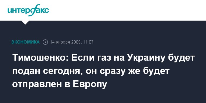 Москва. 14 января. INTERFAX.RU - Поставки газа в страны Европы начнутся сразу после того, как Российская Федерация начнет подавать его на Украину, заявила премьер-министр Украины Юлия Тимошенко.