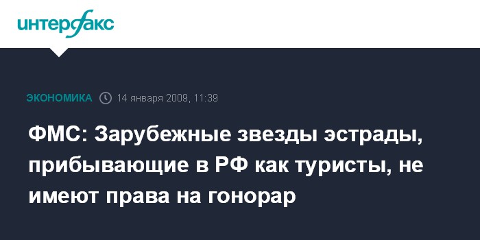 Москва. 14 января. INTERFAX.RU - Иностранные эстрадные звезды, приезжающие в Россию по туристическим визам на корпоративные вечеринки, не имеют права на получение гонораров, заявляют в Федеральной миграционной службе (ФМС) России.