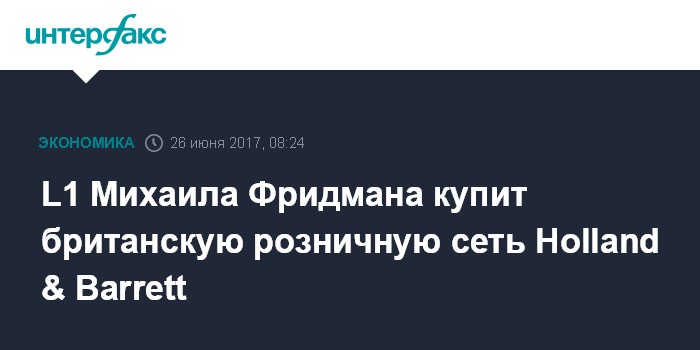 Москва. 26 июня. INTERFAX.RU - LetterOne (L1), управляющая активами "Альфа-групп" Михаила Фридмана и партнеров, договорилась приобрести сеть магазинов здорового питания Holland & Barrett за 1,8 млрд фунтов, сообщает Financial Times.