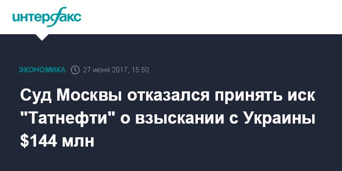 Москва. 27 июня. INTERFAX.RU - Арбитражный суд Москвы отказался принять заявление "Татнефти" о приведении в исполнение решения иностранного суда о взыскании с Украины о выплате компенсации в рамках дела "Укртатнафты" в размере $144 млн, передает корреспондент "Интерфакса" из суда. Представитель компании заявил "Интерфаксу", что решение будет обжаловано.