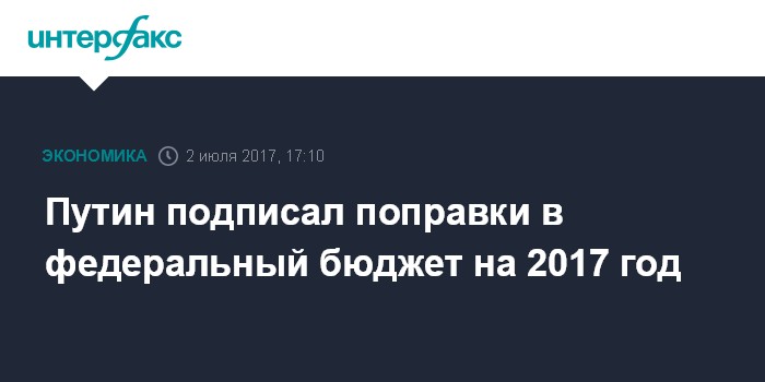 Москва. 2 июля. INTERFAX.RU - Президент России Владимир Путин подписал федеральный закон о внесении поправок в федеральный бюджет на 2017 год и плановый период 2018-2019 годов, соответствующий документ опубликован в воскресенье на официальном портале правовой информации.