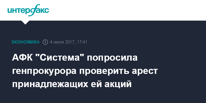 Москва. 4 июля. INTERFAX.RU - "Система" просит генерального прокурора РФ проверить законность действий судебного пристава, запретившего АФК получать доход по арестованным акциям, сообщил "Интерфаксу" официальный представитель АФК "Система" Сергей Копытов.