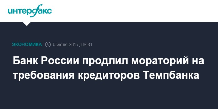 Москва. 5 июля. INTERFAX.RU - Банк России 5 июля продлил мораторий на удовлетворение требований кредиторов Темпбанка (Москва) на три месяца, но не более срока действия временной администрации, говорится в сообщении регулятора.