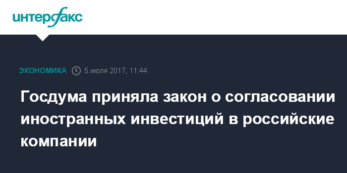 Москва. 5 июля. INTERFAX.RU - Госдума на заседании в среду приняла в третьем чтении закон, который дает правительству право отправлять на согласование сделки иностранных инвесторов в отношении российских компаний.