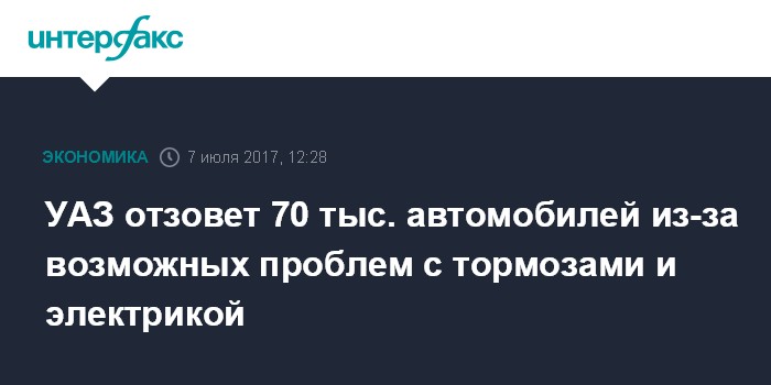 Москва. 7 июля. INTERFAX.RU - ООО "Ульяновский автомобильный завод" ("УАЗ", входит в группу "Соллерс") объявляет о начале отзывной кампании на автомобили УАЗ "Патриот", УАЗ "Пикап" и УАЗ "Карго", произведенные в период с января 2014 года по май 2017 года, сообщила компания.