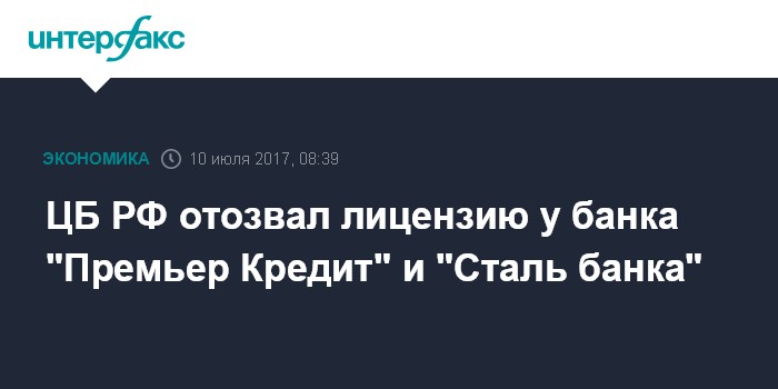 ЦБ РФ отозвал лицензию у банка "Премьер Кредит" и "Сталь банка"